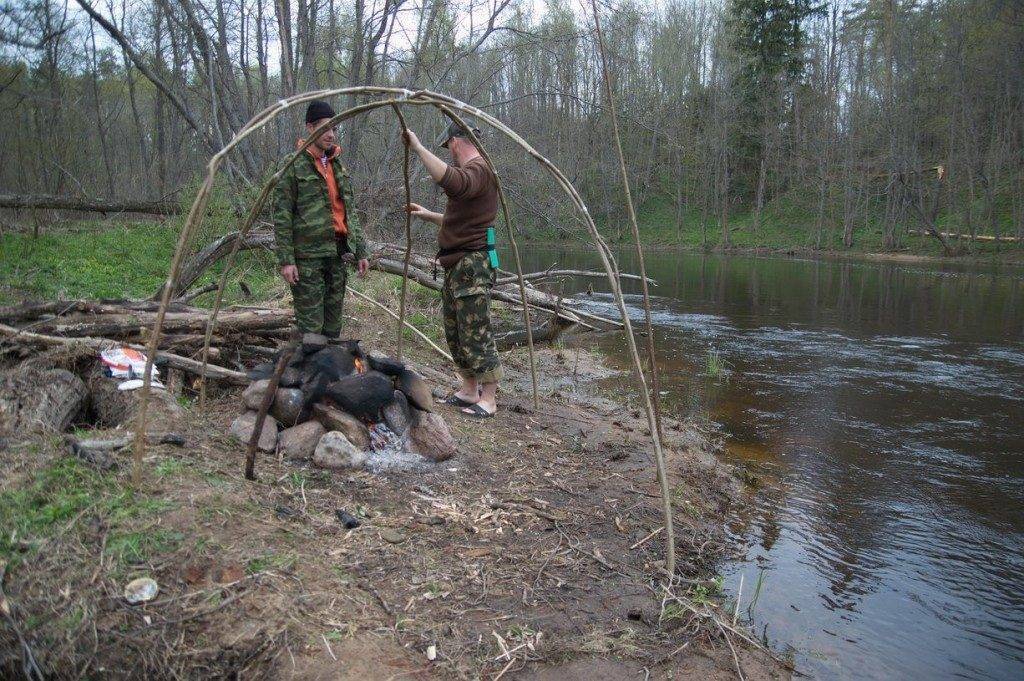 Некоторые «бывалые» путешественники используют для каркаса трубки от палатки, доску, металлические трубы, заранее подготовленные и привезенные автомобилем. Этот вариант значительно снизит ваши труды, но опять же — требует применения транспортных средств.