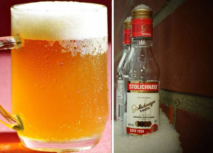 1). Коктейль «Ёрш»: пиво с водкой. Оба напитка наливают в одну ёмкость, закрывают и несколько раз резко переворачивают вверх дном, чтобы пиво вспенилось. Идеальная температура ингредиентов – от +15 до +17 °C. Известно два варианта: