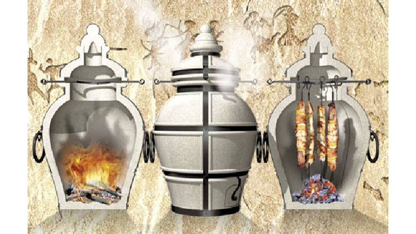 – По своей форме тандыр напоминает компактную переносную вазу. Сверху он закрывается двухуровневой крышкой, а внутри имеет приспособления для вертикального расположения шампуров. Для того, чтобы приготовить блюдо, необходимо заложить дрова внутрь тандыра. После того, как внутренние стенки станут белыми, можно готовить. Кроме того, в нижней части восточной печи предусмотрено отверстие, через которое нужно убрать уголь. Все блюда готовятся только от жара керамических стенок.
