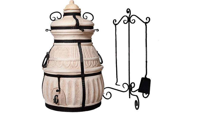 В комплект к тандырной печи входят чехол, который защищает печь от влаги и пыли, термостойкие фартук и рукавицы, многоярусная решетка для приготовления различных блюд, а также шампура и елочка, предназначенные для нанизывания мыса или рыбы, а также овощей для запекания на углях.