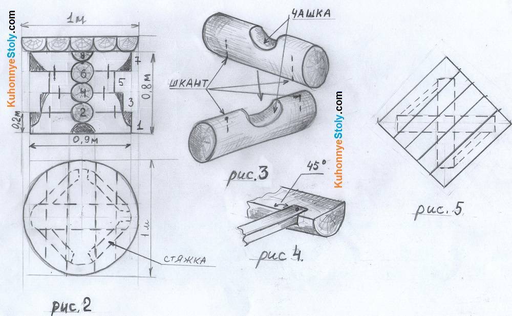 Прежде, чем укладывать детали столешницы, необходимо сделать стяжку из бруска. Расположение показано на рис.2 (нижняя схема, пунктир), схема врезки – на рис.4. Торцевые части бревен опиливаются, как показано штриховкой на рис.1.