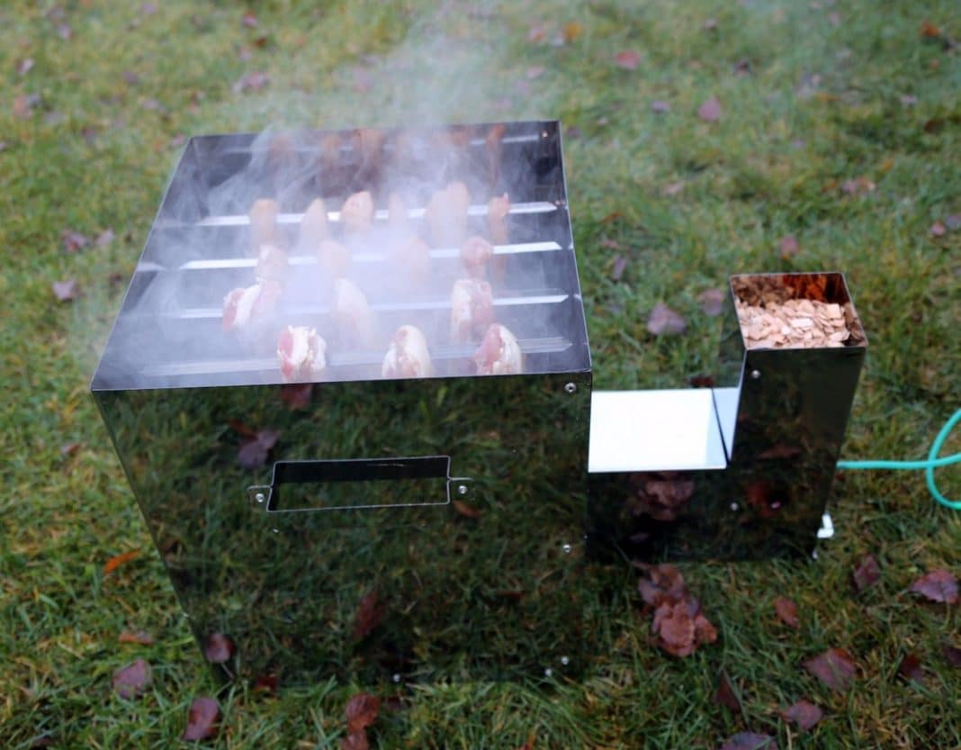 - Засыпают в поддон щепу ольхи, бука или абрикоса, поддерживают сильный огонь до активного дыма, затем уменьшают.