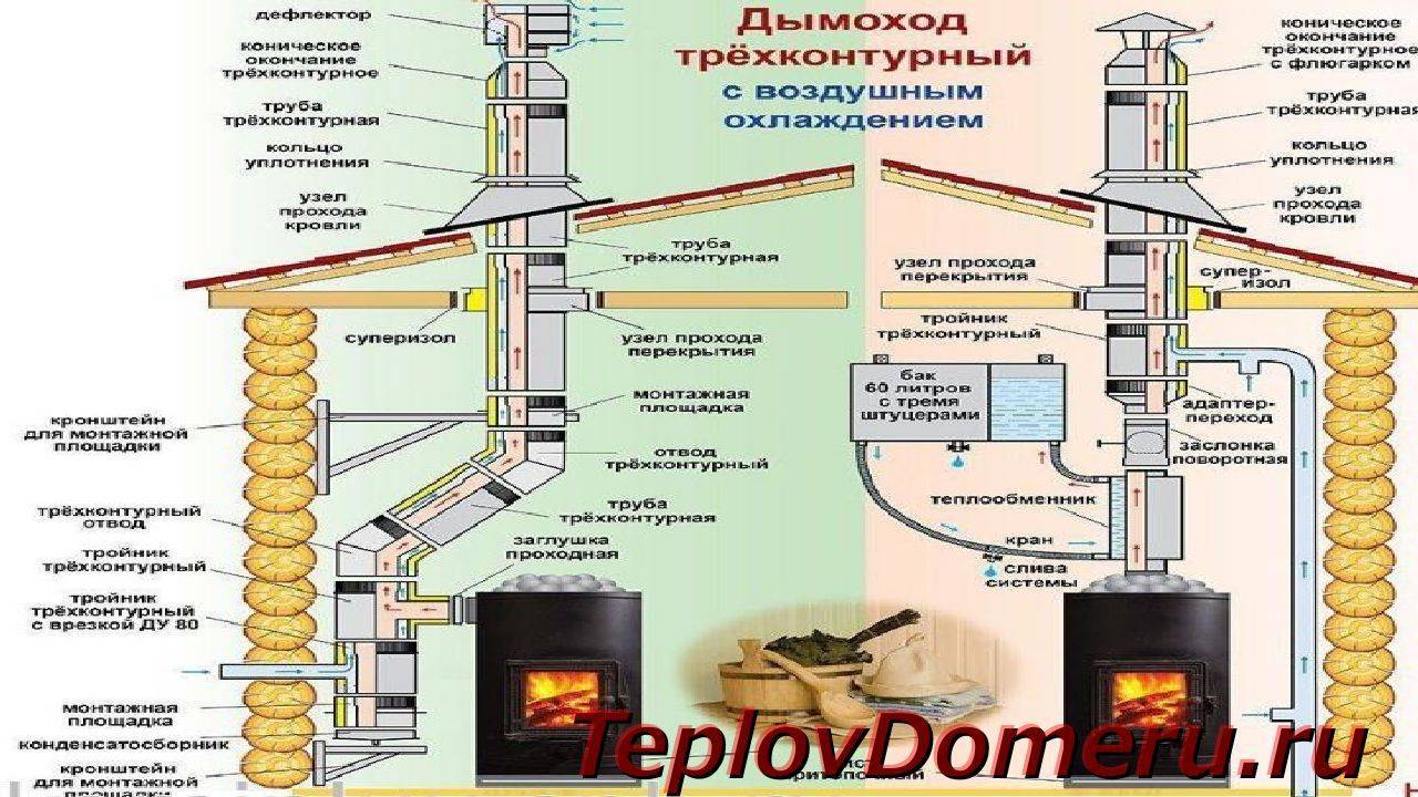 Для твердотопливных, а тем более банных использовать нежелательно. В принципе можно, но очень скоро придется менять весь дымоход. Внешний контур может быть из разных материалов — оцинкованной стали, нержавейки, меди, полиэстера, латуни и т.д. И снова-таки для печей, работающих не твердом топливе, лучше использовать нержавейку, допустима еще оцинковка. Другие материалы применяются для дымоходов более низкотемпературных или для устройства системы вентиляции.