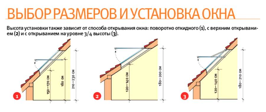Оптимальная высота окна – 2,0-2,5 метра от пола, и если окно расположено не со стороны фронтона, а на скате, то есть под наклоном, то это означает, что для обеспечения такого условия высота рамы будет намного больше, а её расчёт нужно производить по известному правилу из школьного курса геометрии.