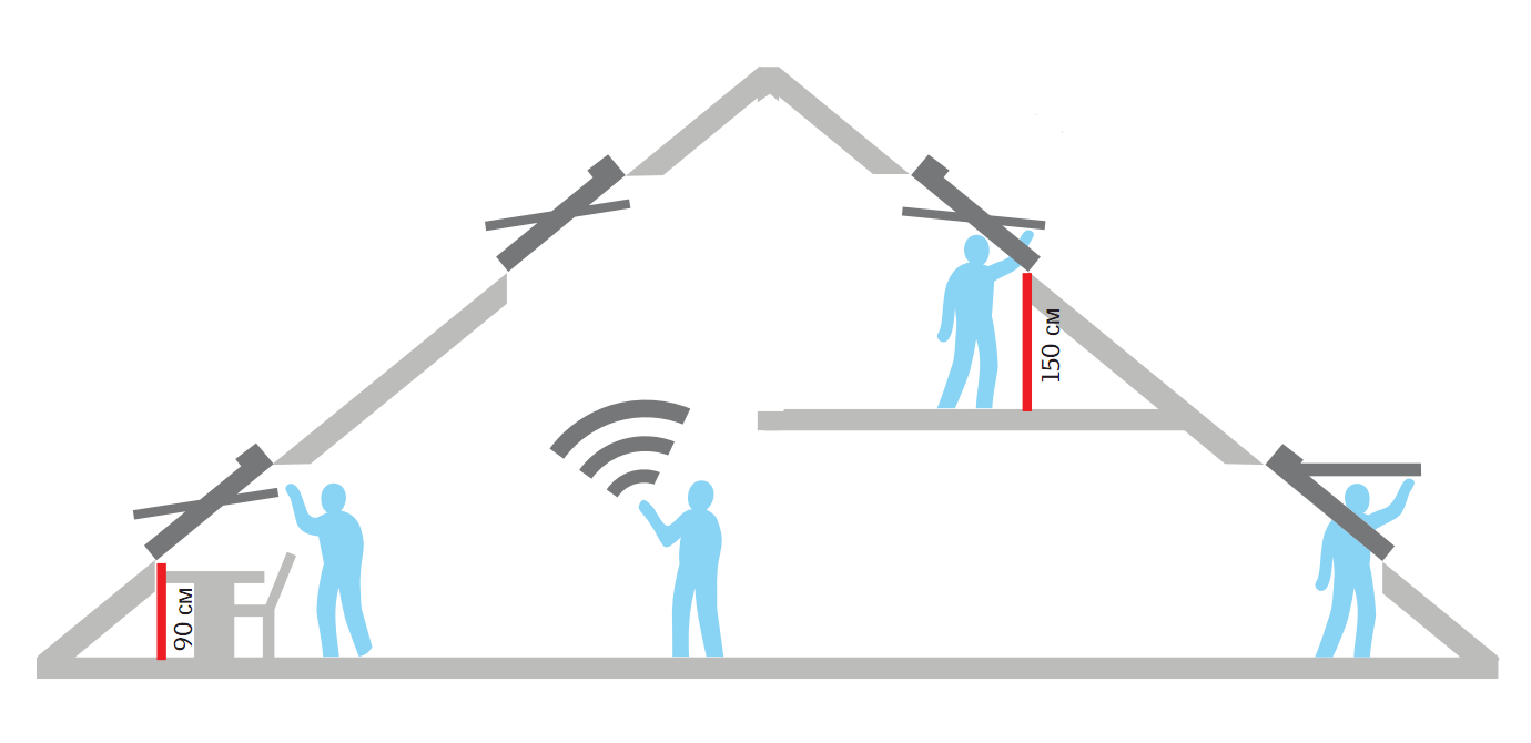 Форма самой кровли также влияет на выбор места расположения и размер оконных проёмов. Для частного дома небольших размеров мансарда обычно состоит из одной комнаты, и в этом случае окна желательно расположить напротив друг друга. А теперь поговорим о высоте их расположения. Если она ниже 1 метра, то это плохое решение с точки зрения безопасности. С другой стороны, одного метра вполне достаточно, чтобы иметь возможность смотреть, что творится снаружи, не вставая со стула, дивана или кресла – для пенсионеров такая возможность будет большим плюсом.