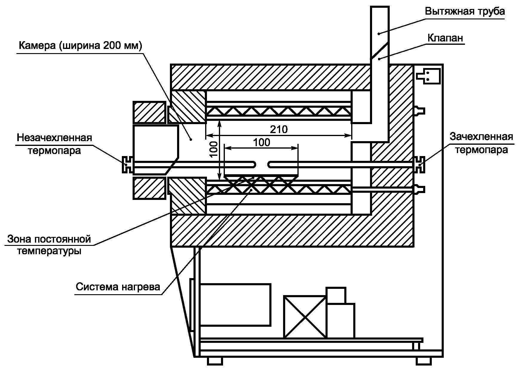 Для удобства работы в нагревательной камере нужно сделать два небольших отверстия: одно на задней стенке диаметром 10 мм – для установки термопары, другое на дверце диаметром 18–20 м – для наблюдения за внутренним пространством печи во время работы. Оба отверстия должны быть снабжены закрывающими металлическими шторками.