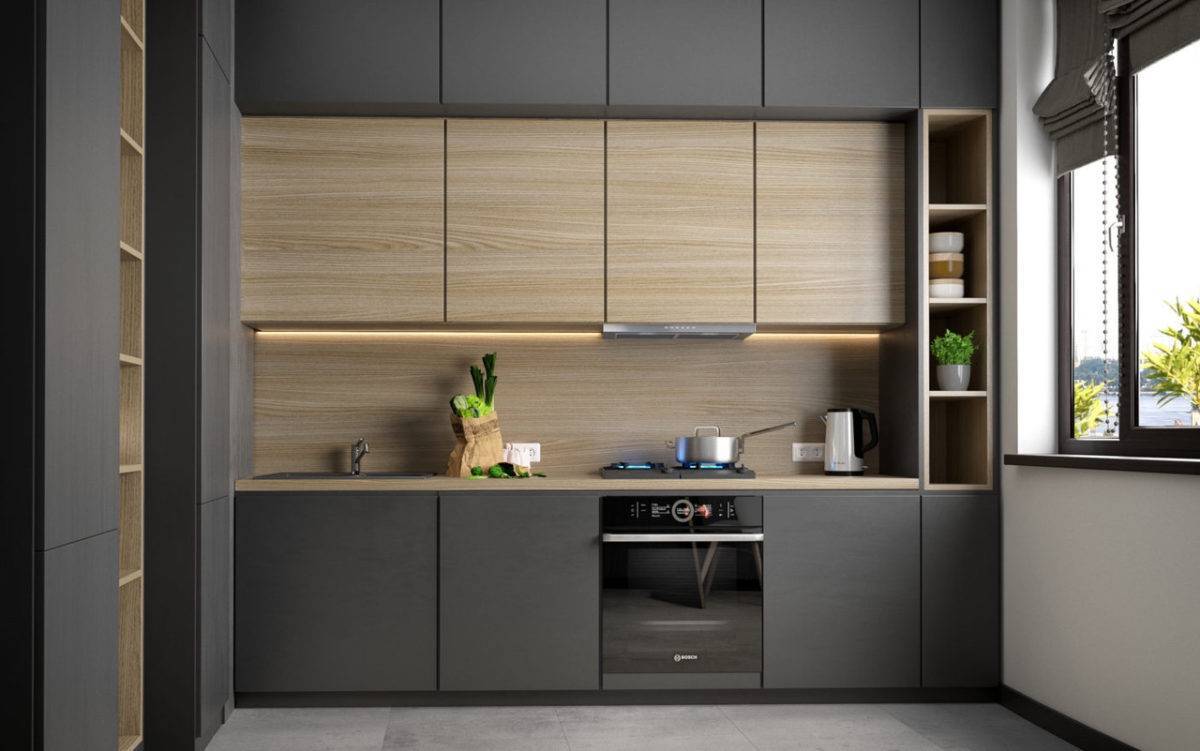 Все остальные цвета для кухонь по наитию. Как показывает практика, если у человека есть любимый цвет, и кухня в мечтах отрисовывалась именно в нём, то отговорить нереально. Только очень не советуем выбирать чёрный и другие тёмные цвета. Чёрный — крутой цвет, но только не для фасадов кухни. На кухне он крайне непрактичен и выглядит скучно. Исключение — чёрный матовый цвет на небольшой части фасадов. Он выглядит круто, но вопросы с практичностью остаются.