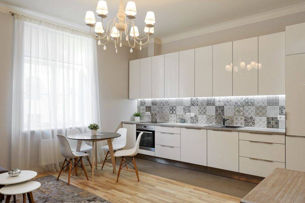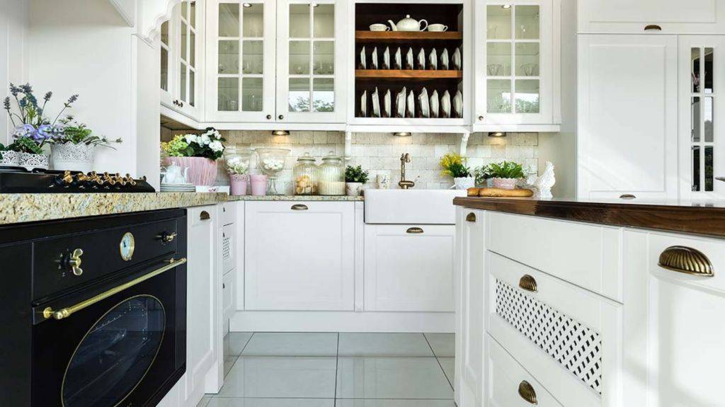 Белая кухня — идеальное решение для небольших интерьеров. Однако, если вас беспокоит, что содержать его в чистоте будет сложно, можно остановить свой выбор на столь же модном бежевом цвете, который отлично вписывается в классические интерьеры.