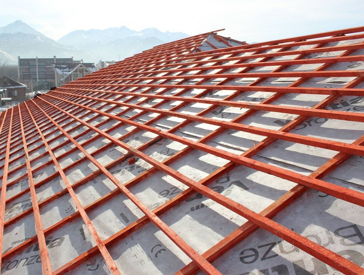 Разметка места укладки обрешёточных брусьев производится посредством мелованного шнура и шаблонов, которые совпадают по размерам с полезной высотой одной черепичной плитки. Стыковку горизонтальных реек выполняют на стропилах.