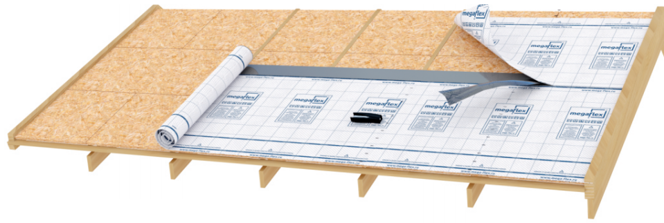 2. Для этого поверх плиты OSB нужно наклеить двустороннюю клейкую ленту (из бутилкаучука) и смонтировать пароизоляционную пленку.