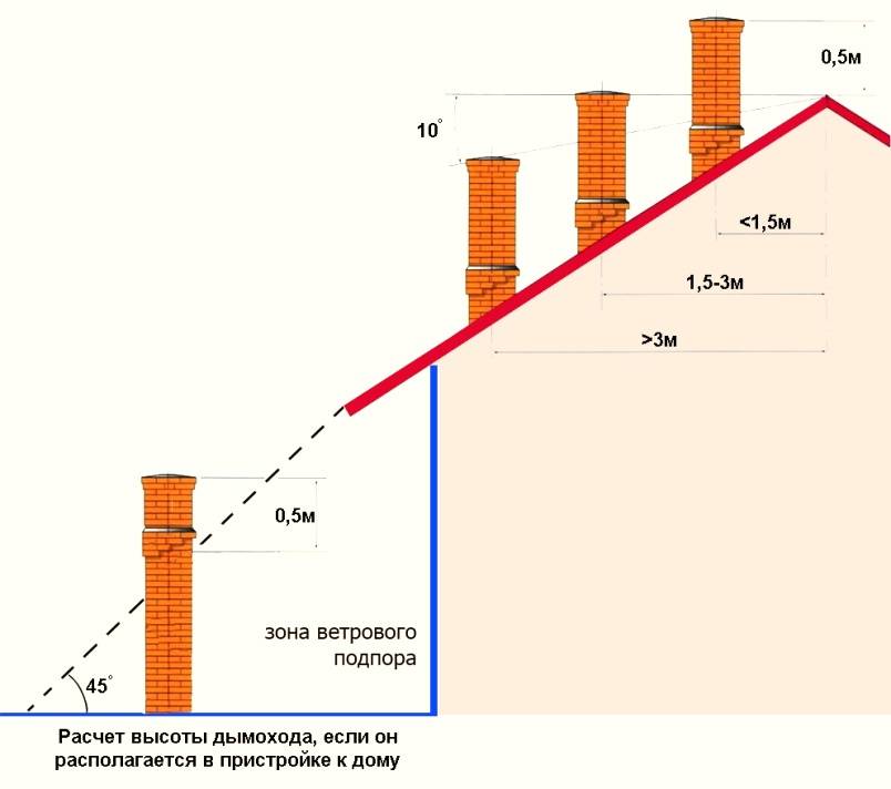 Расположение дымохода на крыше здания очень важно для корректной работы печи. Ранее в статье уже упоминалось, что высота дымовой трубы должна быть не менее 500 мм