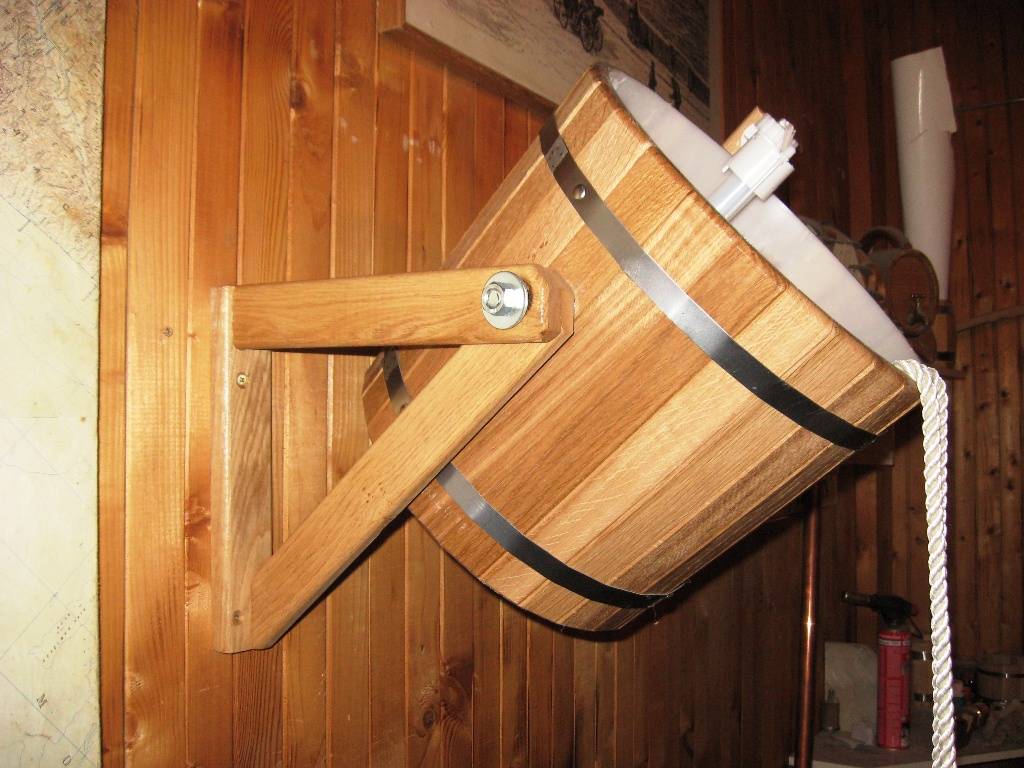 Конструктивное исполнение ведра для обливания в бане может иметь несколько вариантов. В первом случае это обычный резервуар, который нужно будет периодически наполнять вручную. Такая система состоит из емкости для воды, креплений и веревки, с помощью которой опрокидывается ведро. А вторым вариантом является усовершенствованное ведро-водопад с автоматическим наполнением емкости. К основным элементам обливной системы (емкость для воды, кронштейны и веревки) добавляется еще механизм контроля воды в виде поплавка, как в бачке унитаза.