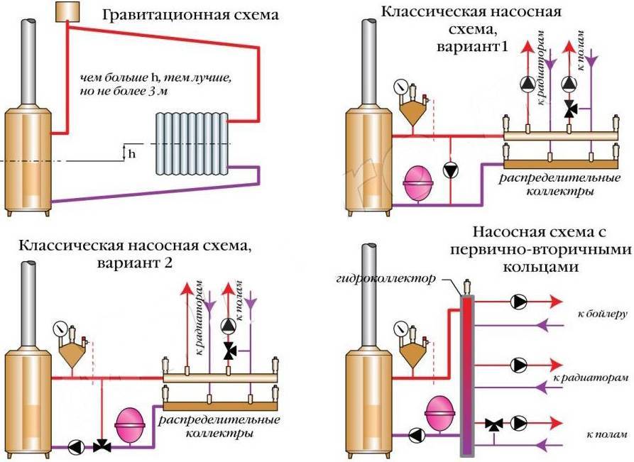 Эта схема требует отдельного помещения для размещения котла, поскольку напольные модели крупногабаритные и зачастую имеют открытую конструкцию топки, работающую с естественной циркуляцией по газовоздушному тракту. Также в схему включают насос для циркуляции теплоносителя, особенно для обвязки двухконтурного газового котла и для многопланового уровня отопления: этажность, разные виды отопления – радиаторная и «теплый пол».