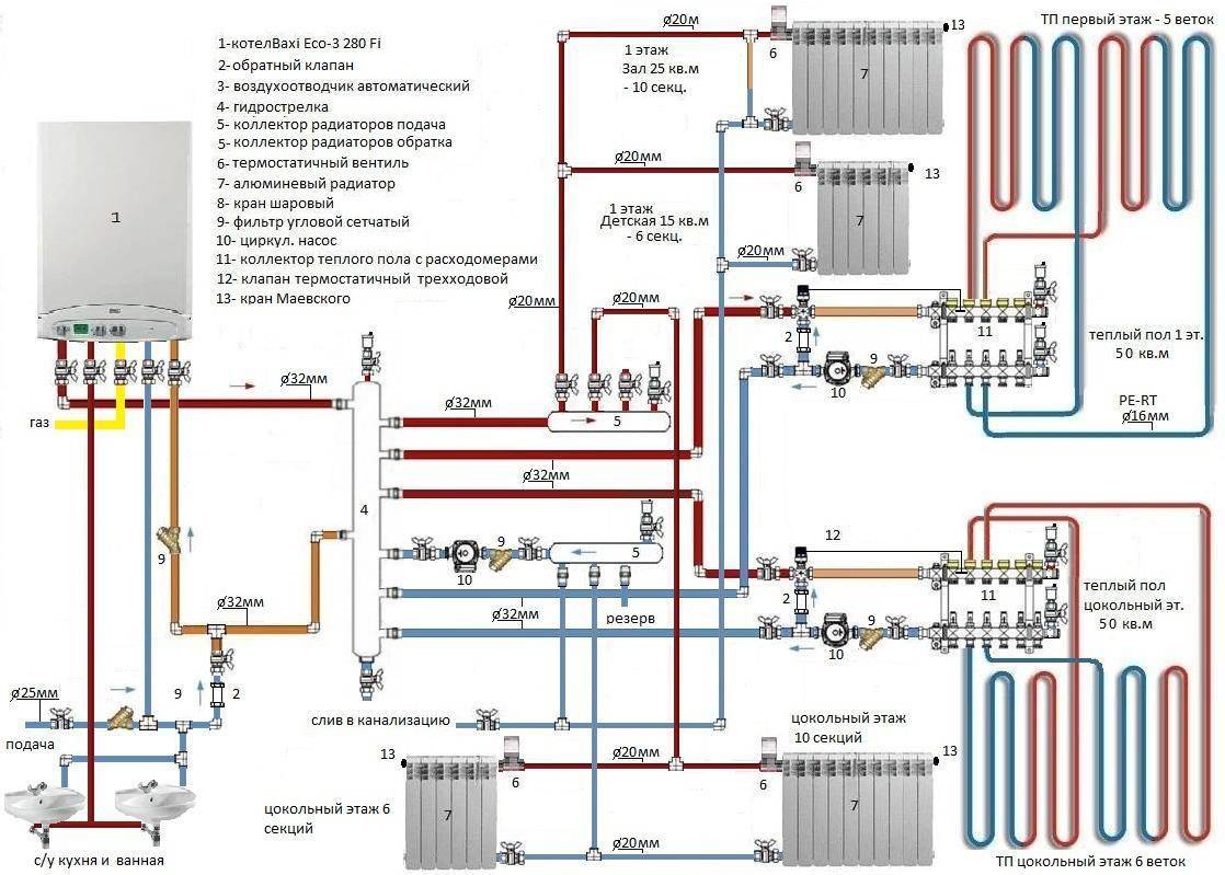 Для обвязки напольного газового котла с разветвленными сетями отопления, и большой протяженности, рекомендуется обвязывать 2 коллектора, с автономным насосом, например, один для низкотемпературного теплоносителя до 50 С системы «теплый пол», а другой до 90 С для обычных радиаторов.