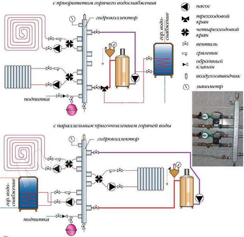 Распределение потоков воды автоматическое, выполняется трехходовым краном, гидравлической стрелкой либо балансировочными кранами.