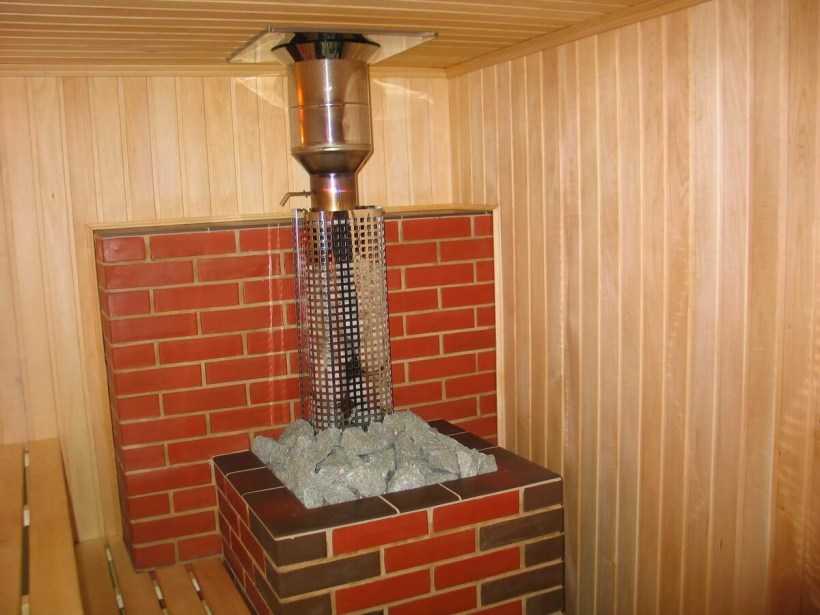 Как вариант можно рассмотреть и наличие в бане одновременно двух нагревателей — печи в парилке и отдельного камина в комнате отдыха. Это рентабельно для больших бань.