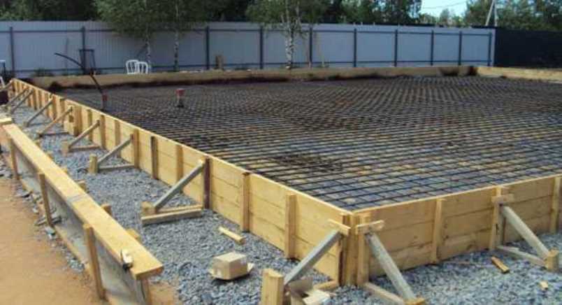 Сплошное основание в виде плиты представляет собой монолитную конструкцию с армирующими прутьями. Плиту устанавливают на воздушную подушку из песка. Опалубку монтируют по всему периметру основания, с внешней стороны устанавливают поддерживающие опоры.