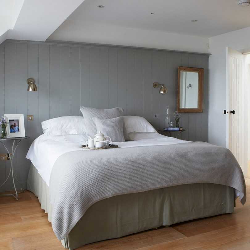 Светло-серая спальня со сдержанным, но в то же время шикарным декором: нашитые вручную объемные цветы