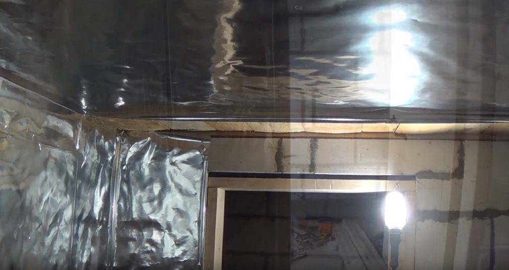 Поверх ваты укладывается слой фольгированной пароизоляции. Полотна крепятся с нахлестом в 10-12 см, стыки проклеиваются алюминиевым скотчем. Для крепления теплоотражающей пароизоляционной пленки пользуются строительным степлером.
