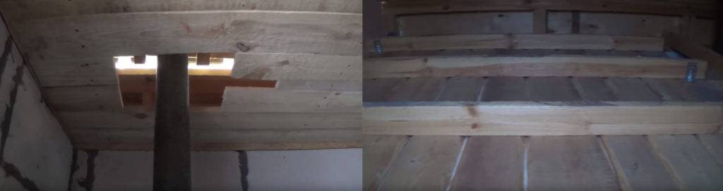 Чтобы все было мастерски, бруски выбирают самые ровные. Крепят скобы к стенам, устанавливают срединный брусок (ставится первым), по краям которого загибают скобы, закрепляют брусочные концы. Дальше следует подгибание скоб промежуточных, монтируют брусок полностью (без деформаций). Последующие бруски ровняют со срединным, размещают по данной плоскости ровно.