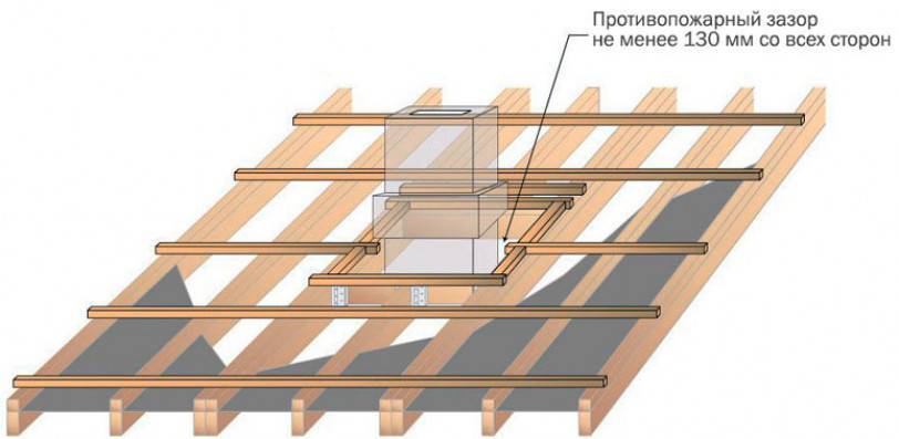 Вокруг дымовой трубы по всему ее периметру, в месте выхода трубы на кровлю, устраивается двухслойный защитный фартук. Первый слой заводится под кровельное покрытие, второй устраивается поверх покрытия.