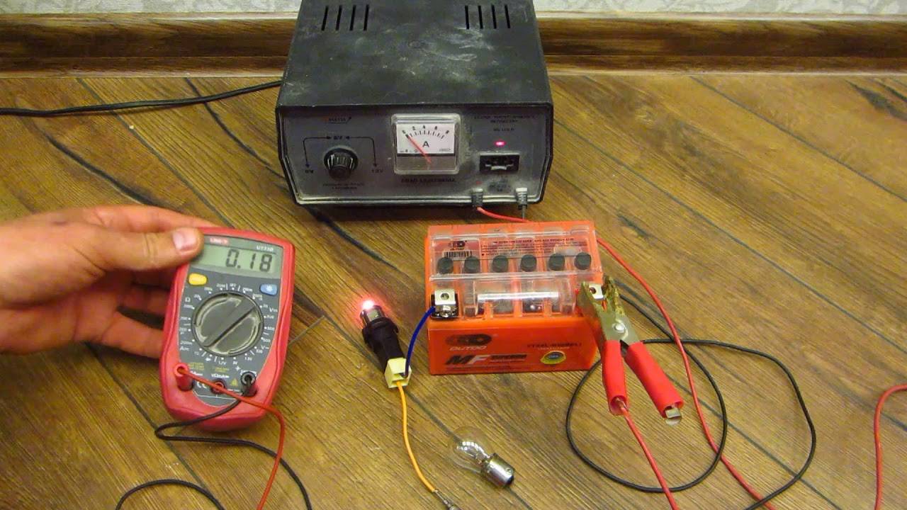 Батарею контролируют специальной нагрузочной вилкой. Прибор состоит из вольтметра и нагрузочных сопротивлений в комплекте с штыревыми контактами. Напряжение на клеммах аккумулятора без нагрузки при плюсовой температуре должно быть 12,5 -12,7 В. Уменьшение напряжения на 0,2 В соответствует потере 20 % заряда.