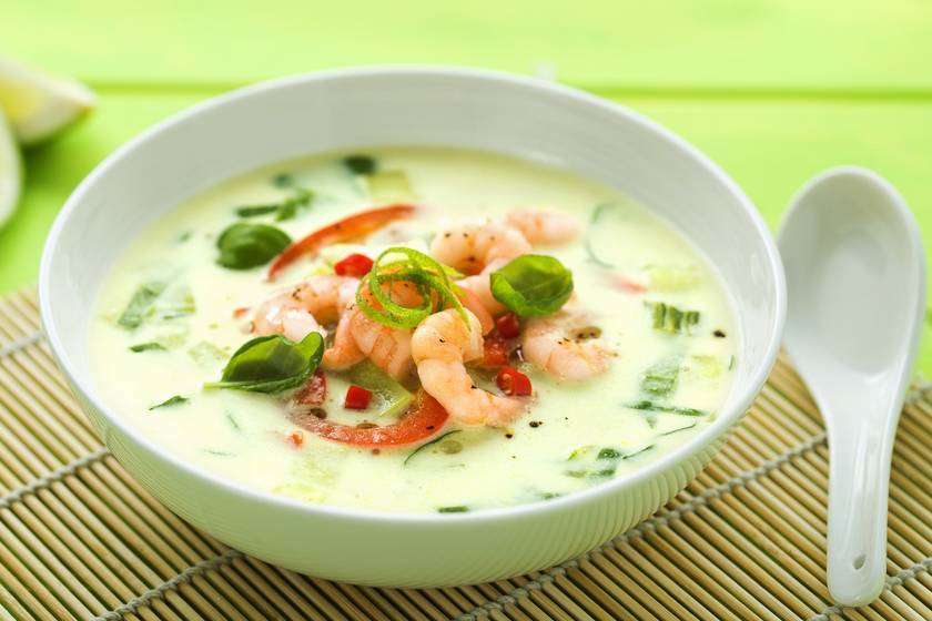 Готовится очень просто – все ингредиенты нужно измельчить в блендере (кроме креветок). Добавить сливки. Получится красивый светло-зеленый суп. Подавать, положив в тарелку креветки и украсив зеленью.