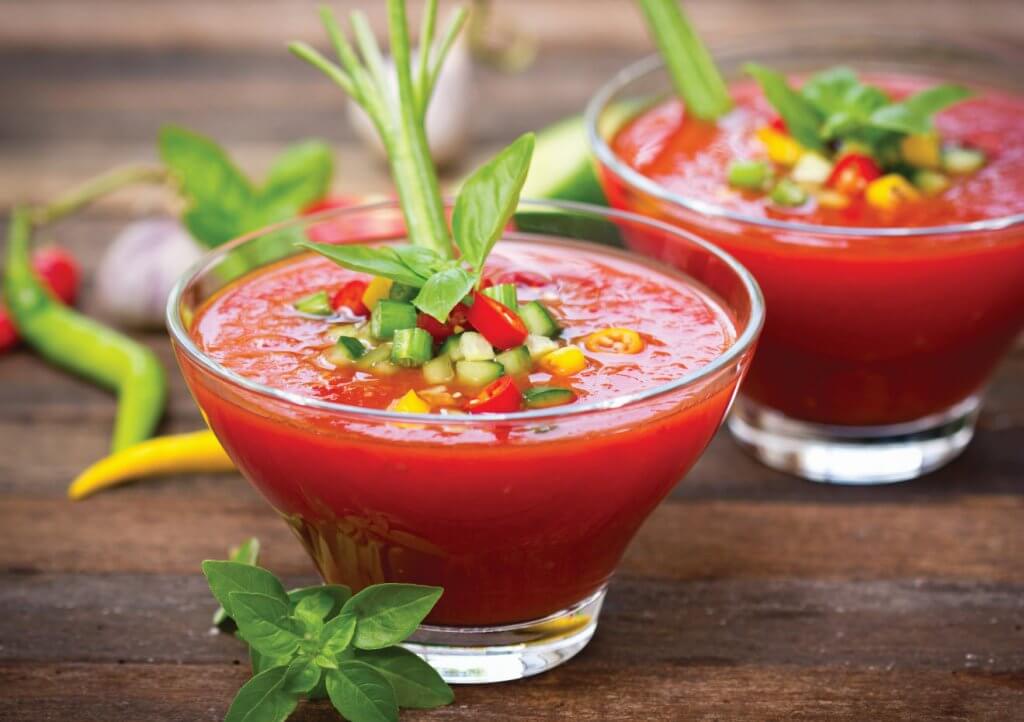 В Испании — гаспачо. Основой супа являются перетертые в пюре томаты, в которые добавляются зелень, мелко нарезанные огурцы, перец, приправы и обязательно кубики белого хлебного мякиша.