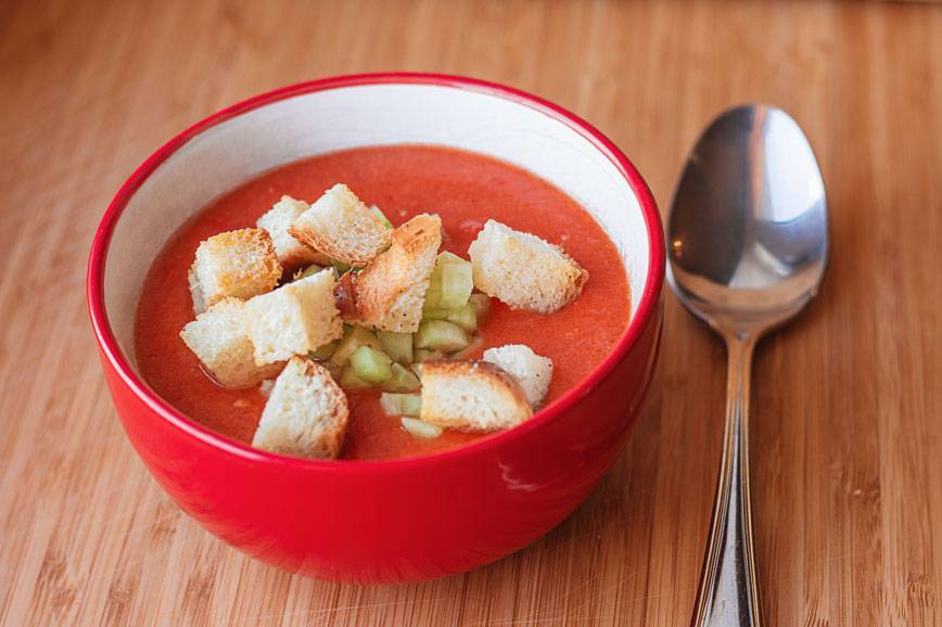 Иначе – испанский томатный суп. Чаще всего подаётся с сухариками, и готовится очень просто: из свежих овощей с добавлением оливкового масла, лимонного сока и специй. Неотъемлемая часть супа – помидоры. А какие овощи использовать кроме томатов – пусть подскажет вам ваша фантазия. Мы же предлагаем вот что.