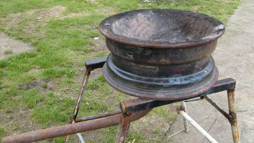 Для этого нужно взять два оставшихся колесных диска и вырезать из одного из них сердцевину. Оба изделия устанавливаются друг на друга и свариваются так, чтобы ступица целого диска оказалась посередине. Она будет выполнять функцию своеобразной обрешетки. Сверху полученной емкости нужно насыпать камни. Нижняя часть конструкции станет верхней частью топки