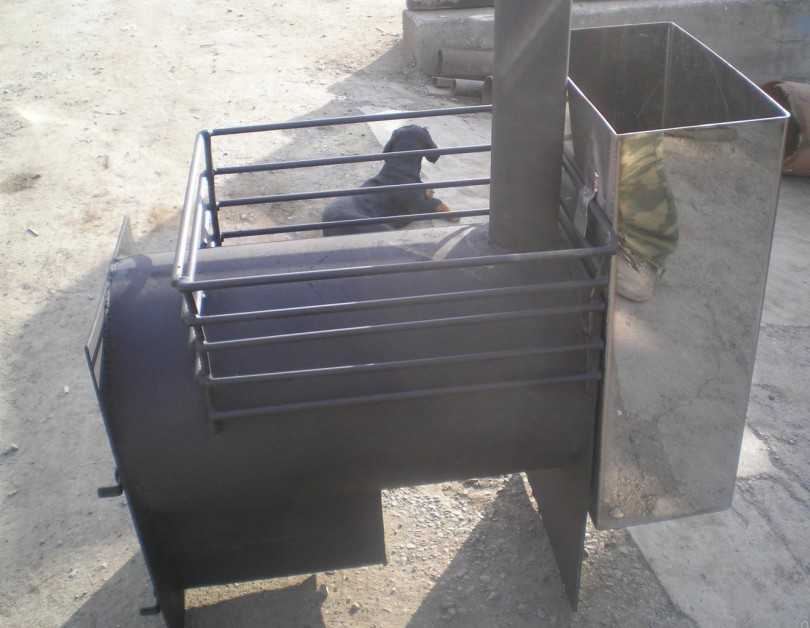 Вот печка с горизонтальной загрузкой топлива. Общая высота ‒ 800 мм, длина ‒ 900 мм, ширина ‒ 600 мм. Для устойчивого положения снизу приварены металлические ножки. Камни укладываются сверху на решетке. К такой конструкции допустимо подключать теплообменник.