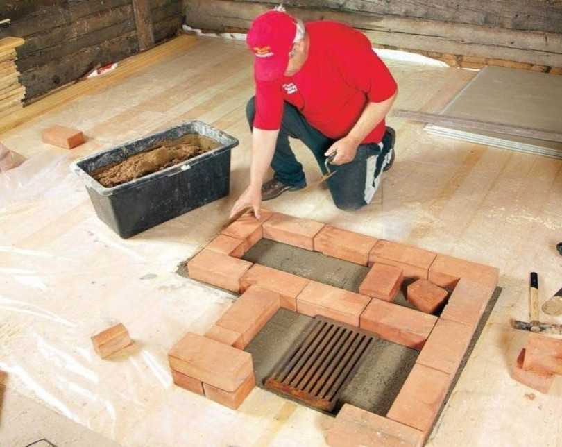 Верхний срез фундамента должен быть на несколько сантиметров ниже пола. Затем, для гидроизоляции, настилают два слоя рубероида, поверх которых укладывается один слой кирпича, а поверх него – металлический лист, служащий для защиты деревянного пола от пожара.
