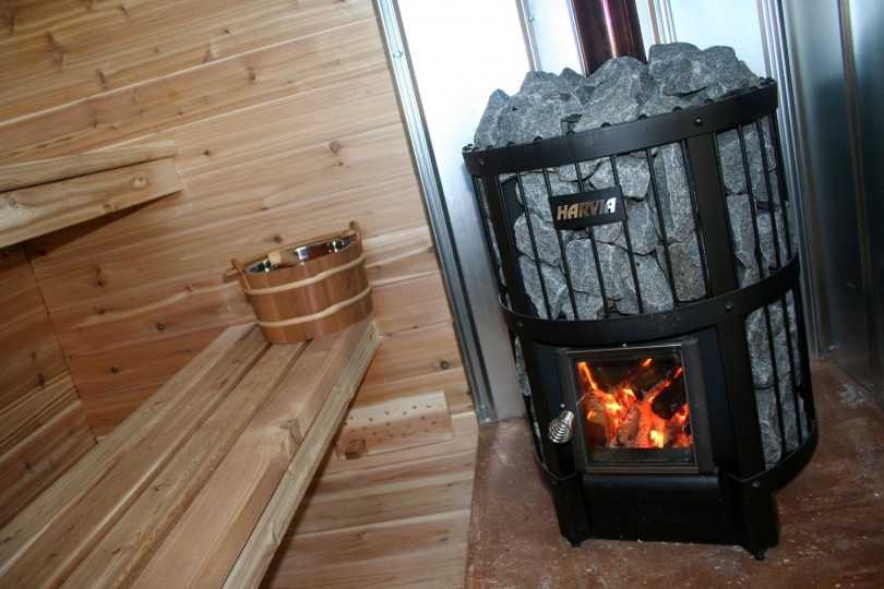Самодельная печь из трубы или подобных материалов диаметром 50-60 см имеет мощность, достаточную для отопления парной объемом около 20 м³ (примерные размеры – 2х3 м), получения 3-4 ведер кипятка и накаливания камней для образования качественного пара с температурой около +100°С. Эти показатели одинаковы для конструкций любого типа.