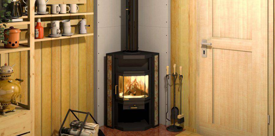 Главным достоинством этой печи является то, что она компактна и очень быстро нагревается. Сама угловая печь представляет собой отопительный прибор с топкой, который закрыт специальным стеклом. Некоторые модели металлических печей состоят из плиты, и бака – теплообменника, который можно подсоединить к общему отоплению.