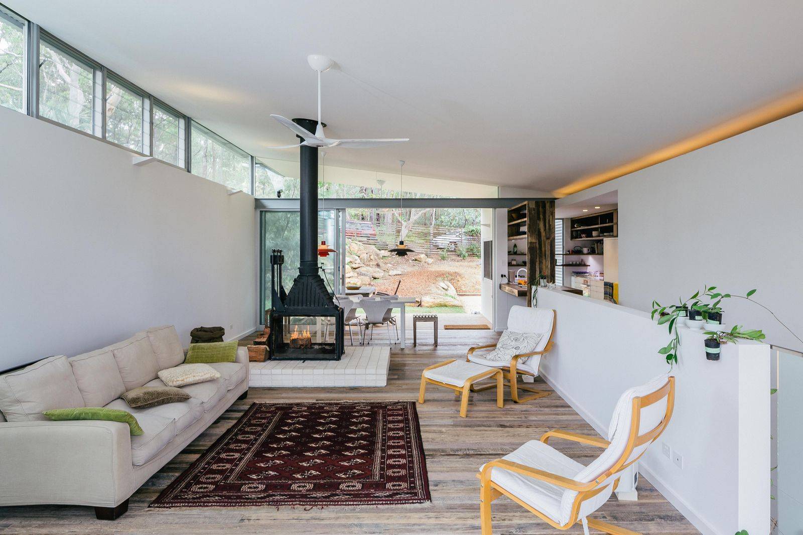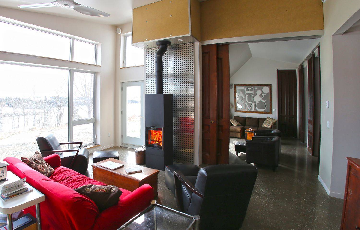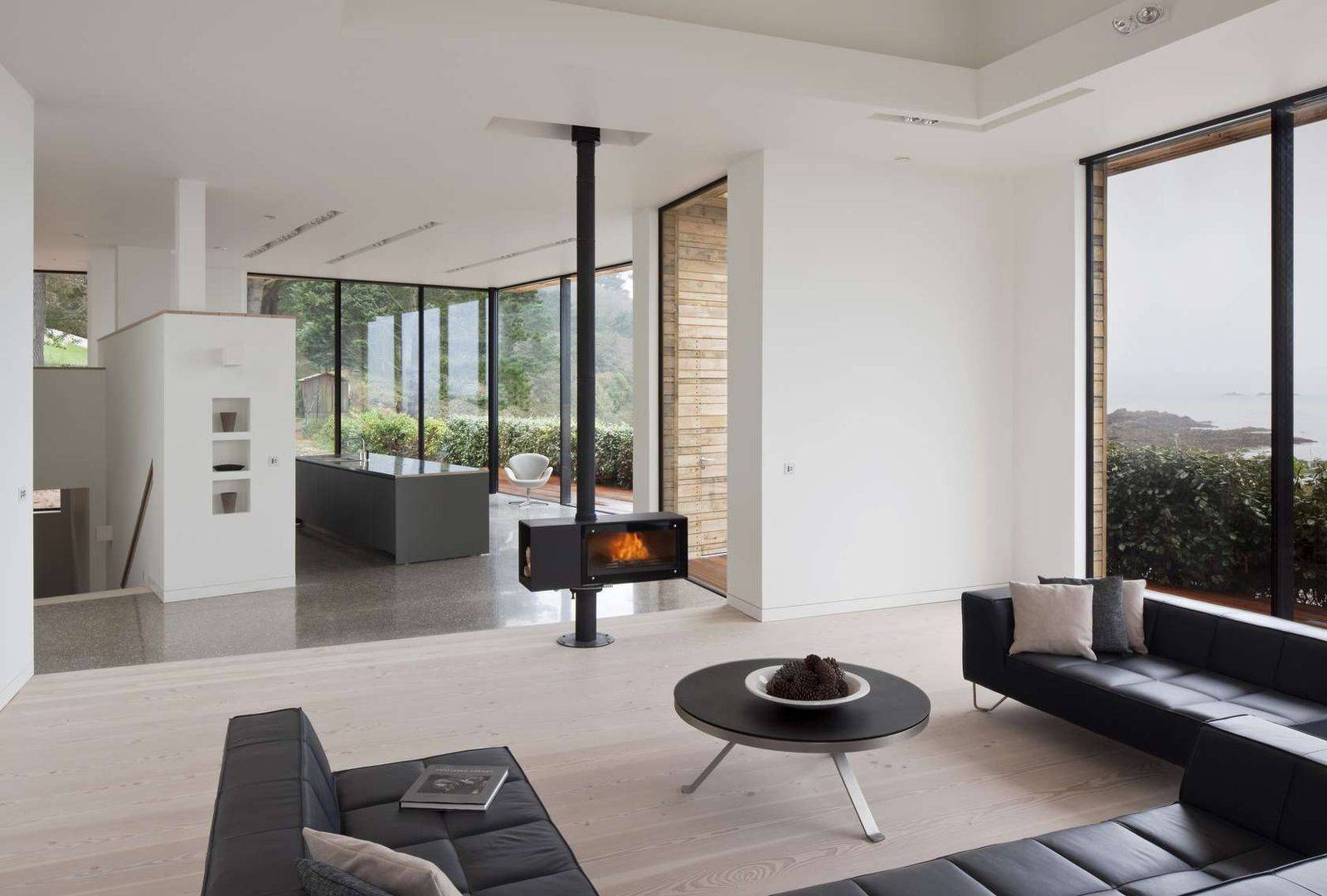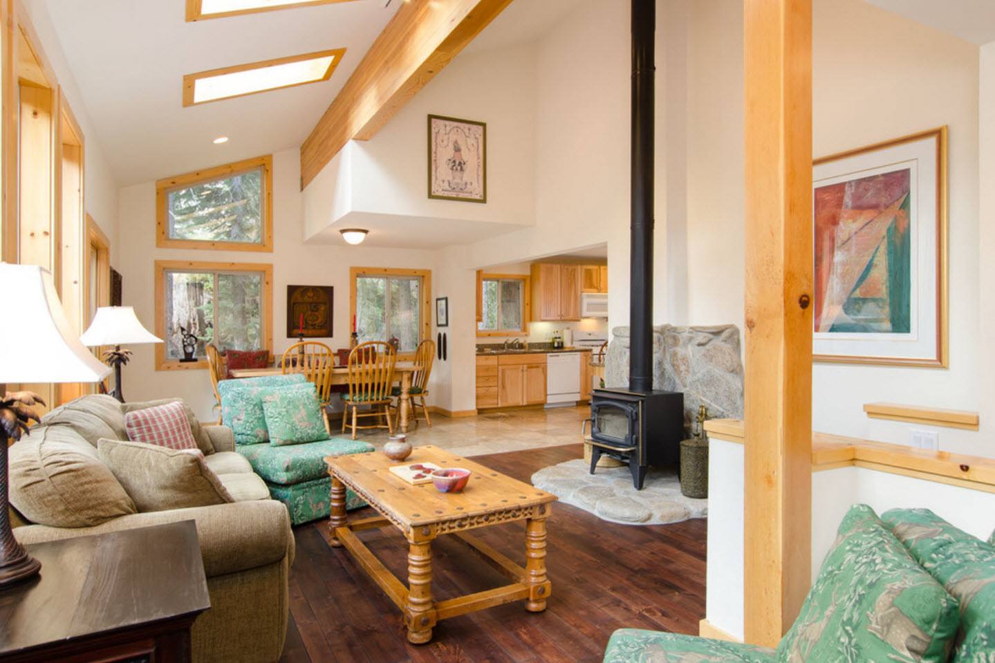 При совмещении гостиной с кухней возможно разделение функций: отопление открытым огнём в гостиной, варочная панель — в кухне.