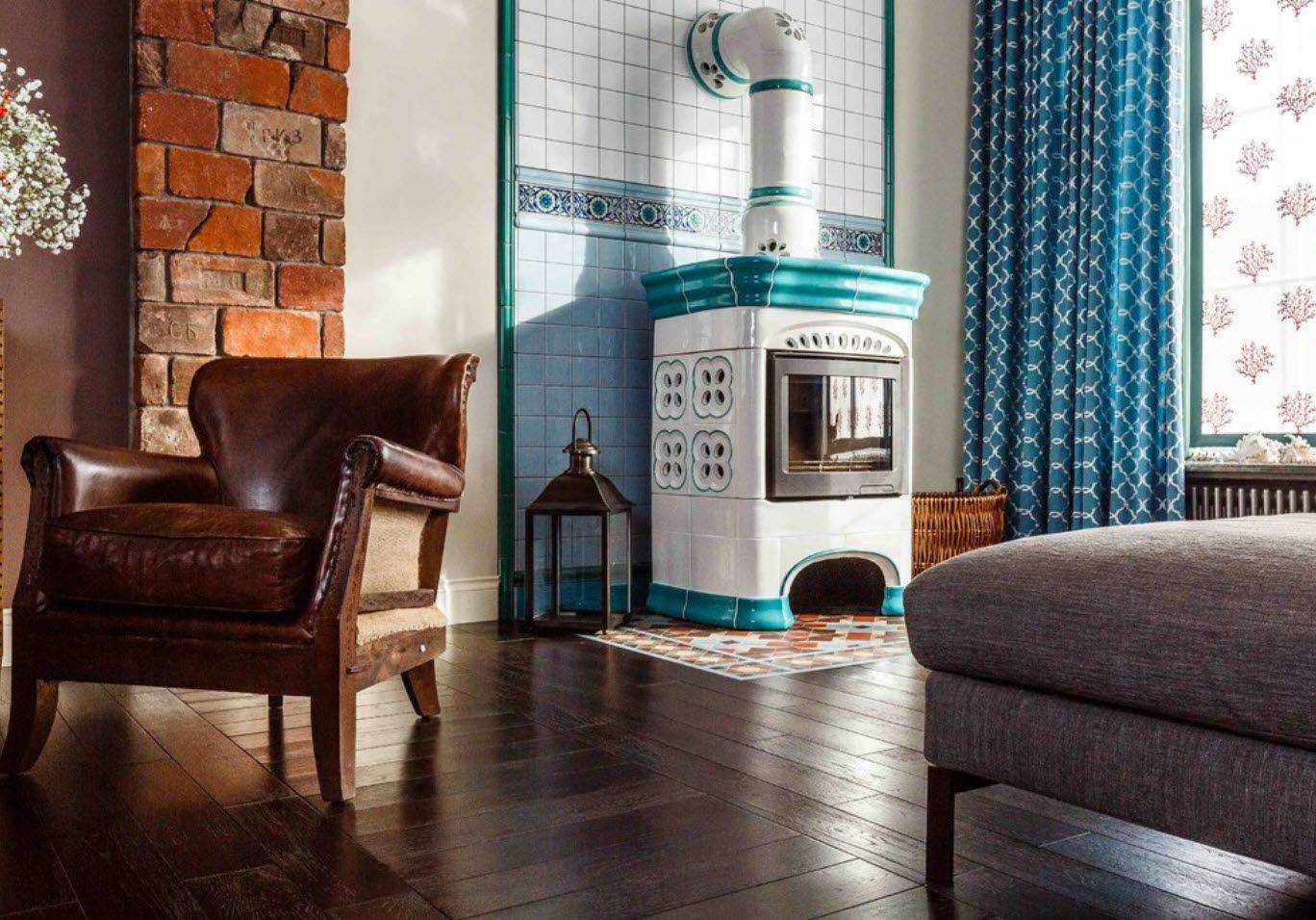 - Лучшим выбором для кухни будет отопительный блок с варочной поверхностью. Подойдёт стиль прованс, кантри, этно, а-ля-рюс. При достаточной площади печь можно совместить с тёплой лежанкой.