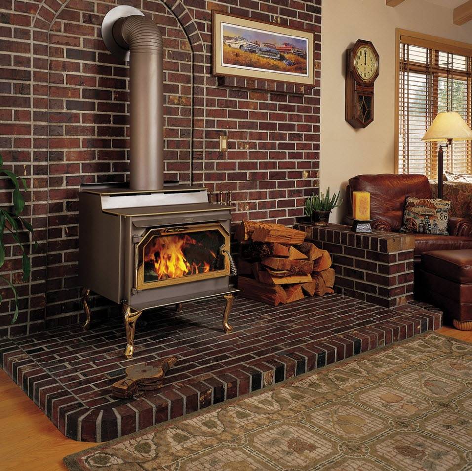 Каминная печь из металла быстро набирает и отдаёт тепло, корпус накаляется. Некоторые производители уже в процессе изготовления облицовывают корпус печи огнеупорной керамикой. Отделка места установки шамотным кирпичом сочетает в себе защитную функцию и декоративность.
