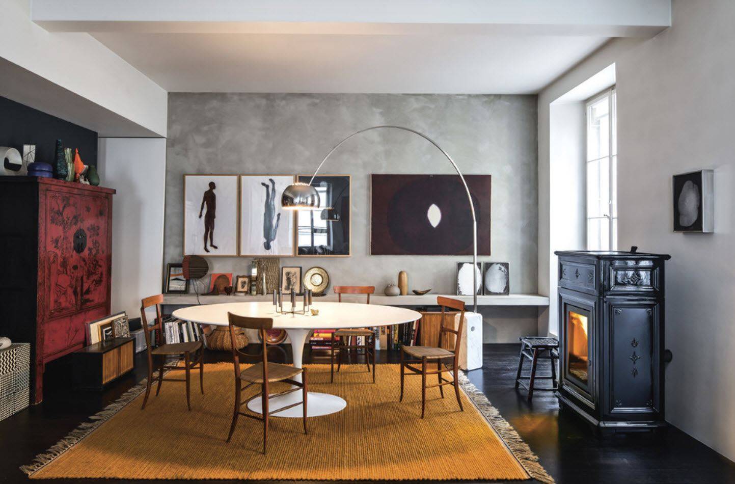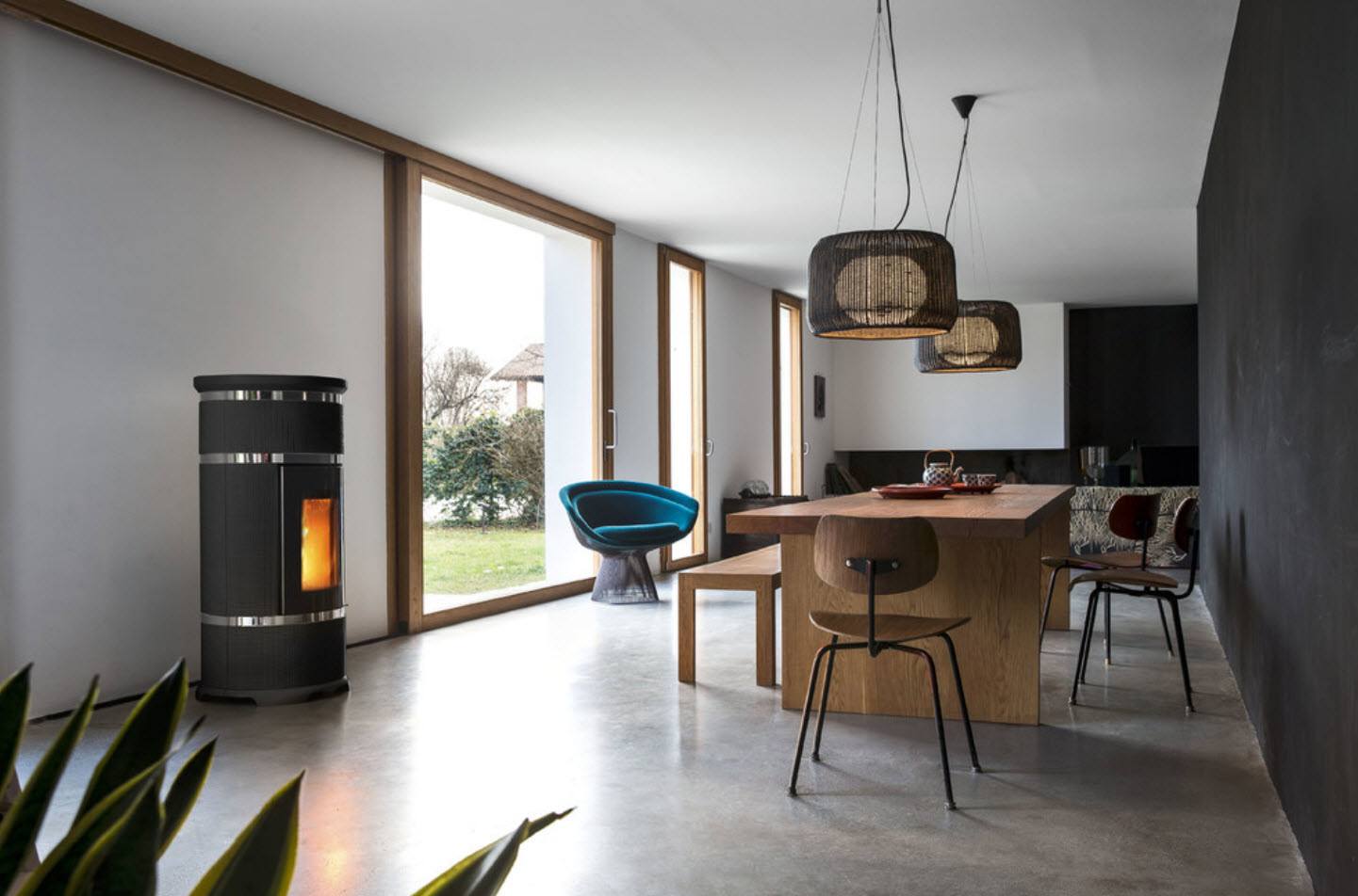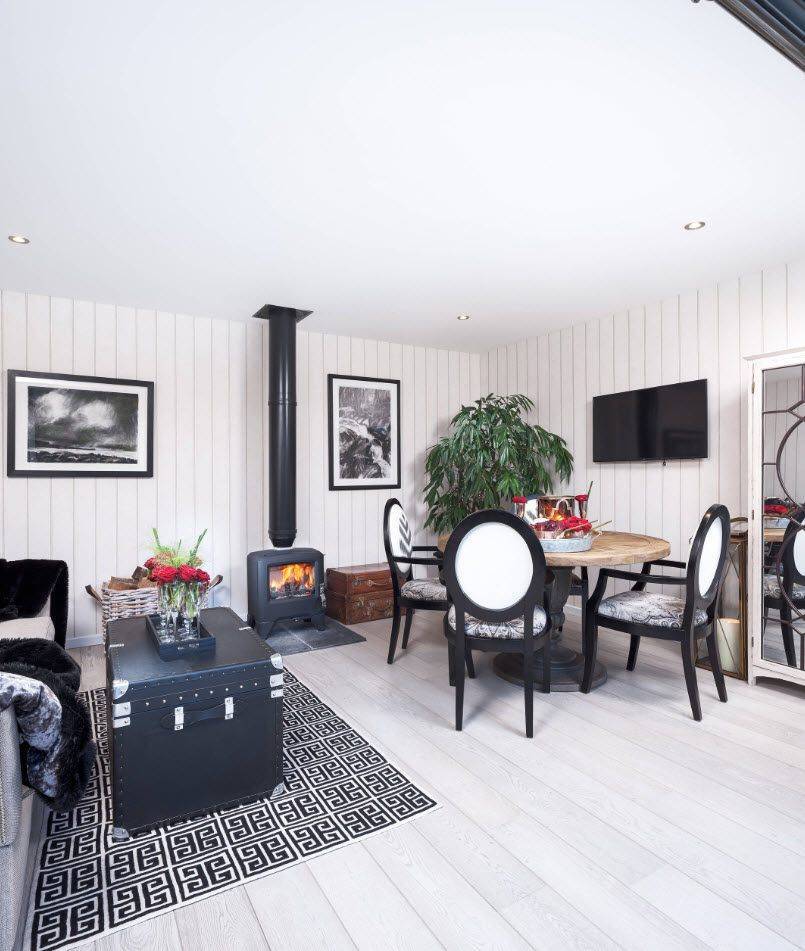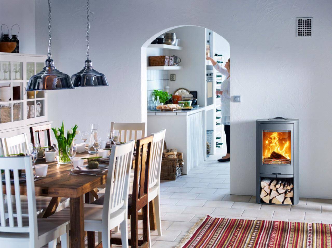- В столовой для создания уюта моноблок устанавливают в нишу стены. Декоративное оформление без лишней помпезности, главное действующее «лицо» — живой огонь.