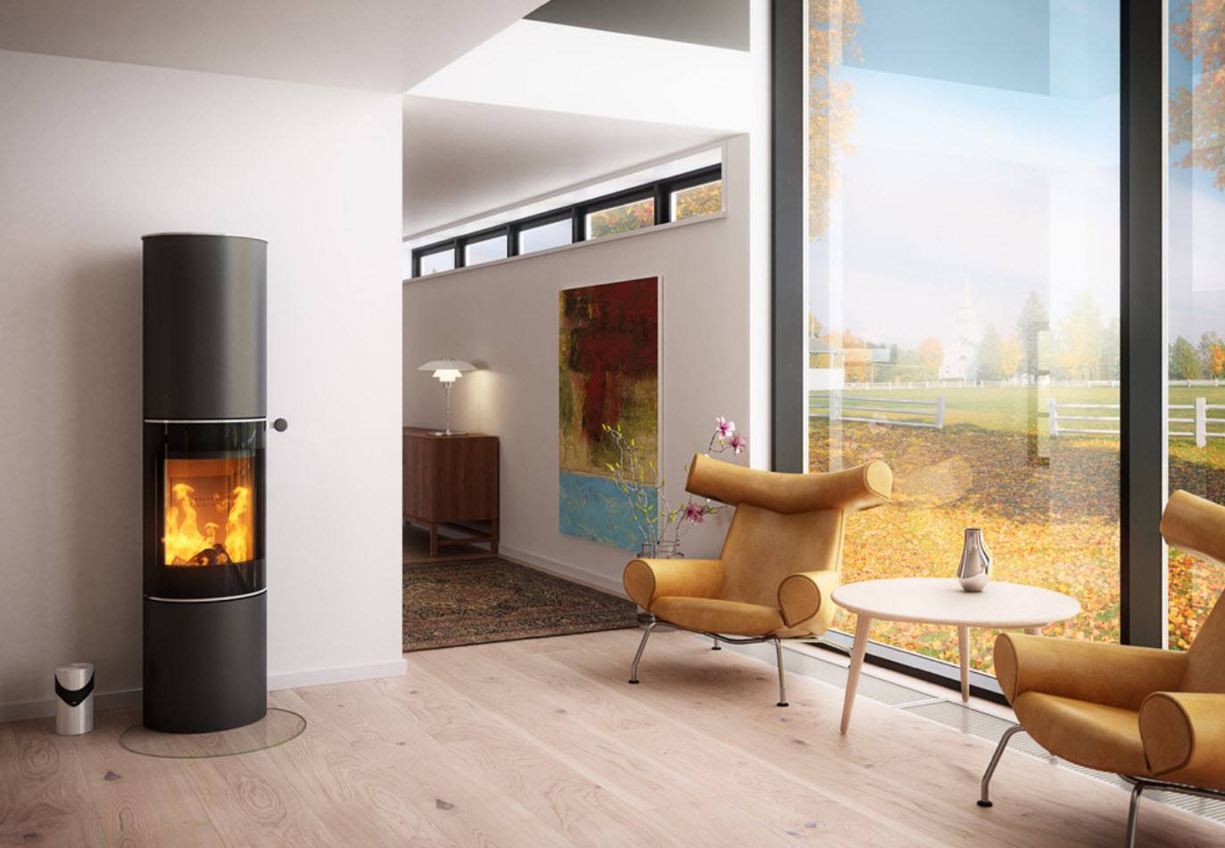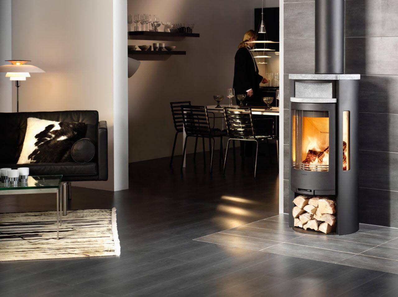 Печи-камины из года в год представляют собой более богатый ассортимент решений. Нейтральные основы из прозрачного, закаленного стекла позволяют стелить деревянный паркет под плитой, не беспокоясь о его повреждении. Черные круглые маты из графитового закаленного стекла, меди или листа защищают пространство под печью и вокруг нее, тем самым закрывая пол. Печь-камин можно легко изготовить на заказ, выбирая любую форму и размер (круг, полукруг, прямоугольник, угловую модель и другие варианты).