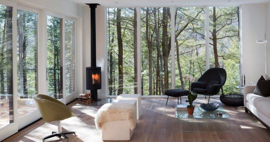 Важно! Для хорошего прогрева помещения не рекомендуется ставить печь-камин между проёмами окон и по наружной стене. Отражающие экраны из нержавеющей стали или термически закалённого стекла, устанавливаемые позади печного блока, служат противопожарной защитой