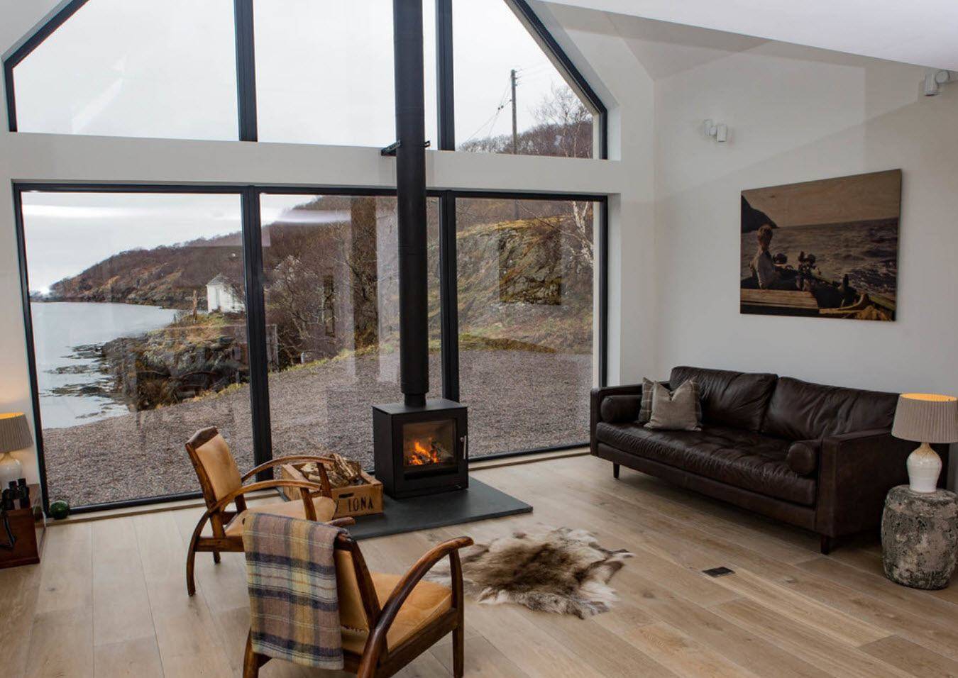 - Для гостиной оптимальным вариантом будет пристенная или встроенная установка по центру стены перпендикулярной той, что имеет окна. Перед камином главной комнаты дома планируют зону отдыха. Стиль портала должен соответствовать назначению помещения, его объёму, эстетическим предпочтениям хозяев. Если гостиная занимает угол дома и имеет 2 взаимно перпендикулярные стены с окнами, то хорошо будет смотреться угловой камин. В помещении большой площади эффектно центральное расположение очага с панорамным обзором.
