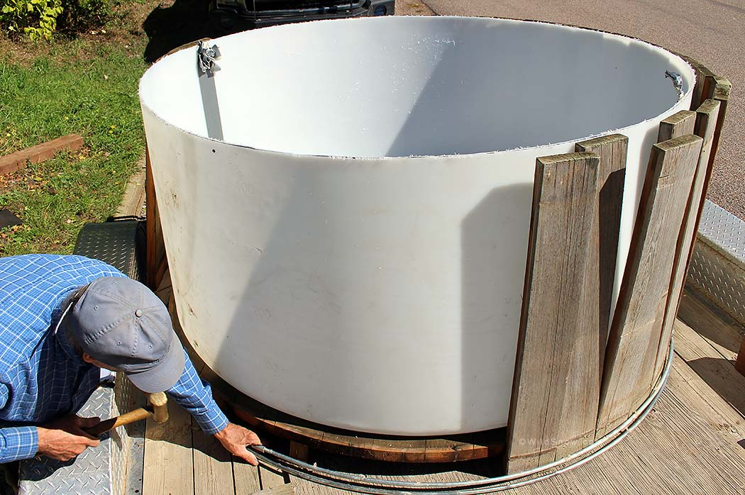 Когда деревянный корпус купели набран – на бочку одевают металлические обручи с натяжными устройствами. Если бочка даст течь – при помощи гаечного ключа можно самостоятельно подтянуть крепёжное устройство обруча.