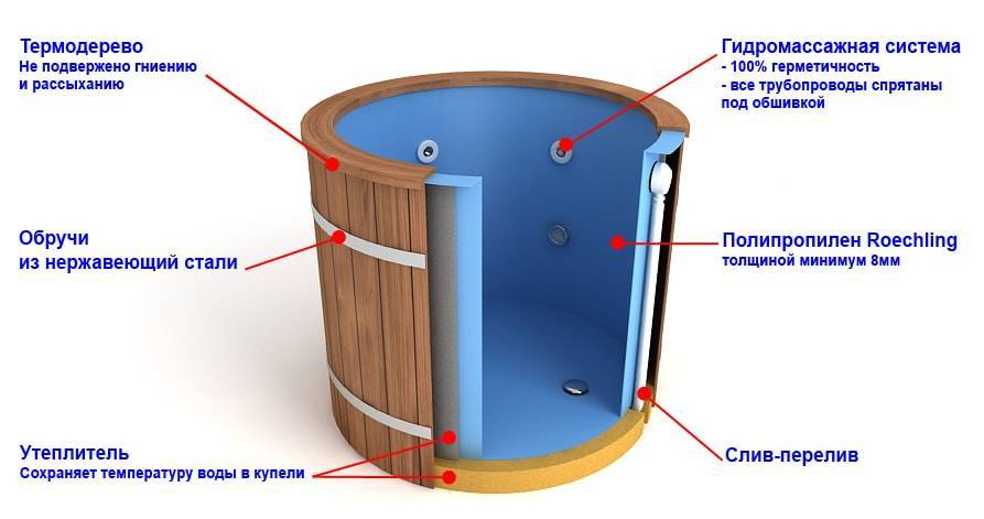Форма купели бывает овальной или круглой, квадратной или угловой. Кроме того, ёмкость может иметь разную «начинку», задача которой – обеспечить дополнительный комфорт. К примеру, здесь может быть установлен гидромассаж, устройство для фильтрования воды, подогрев, сидение или встроенная лесенка.