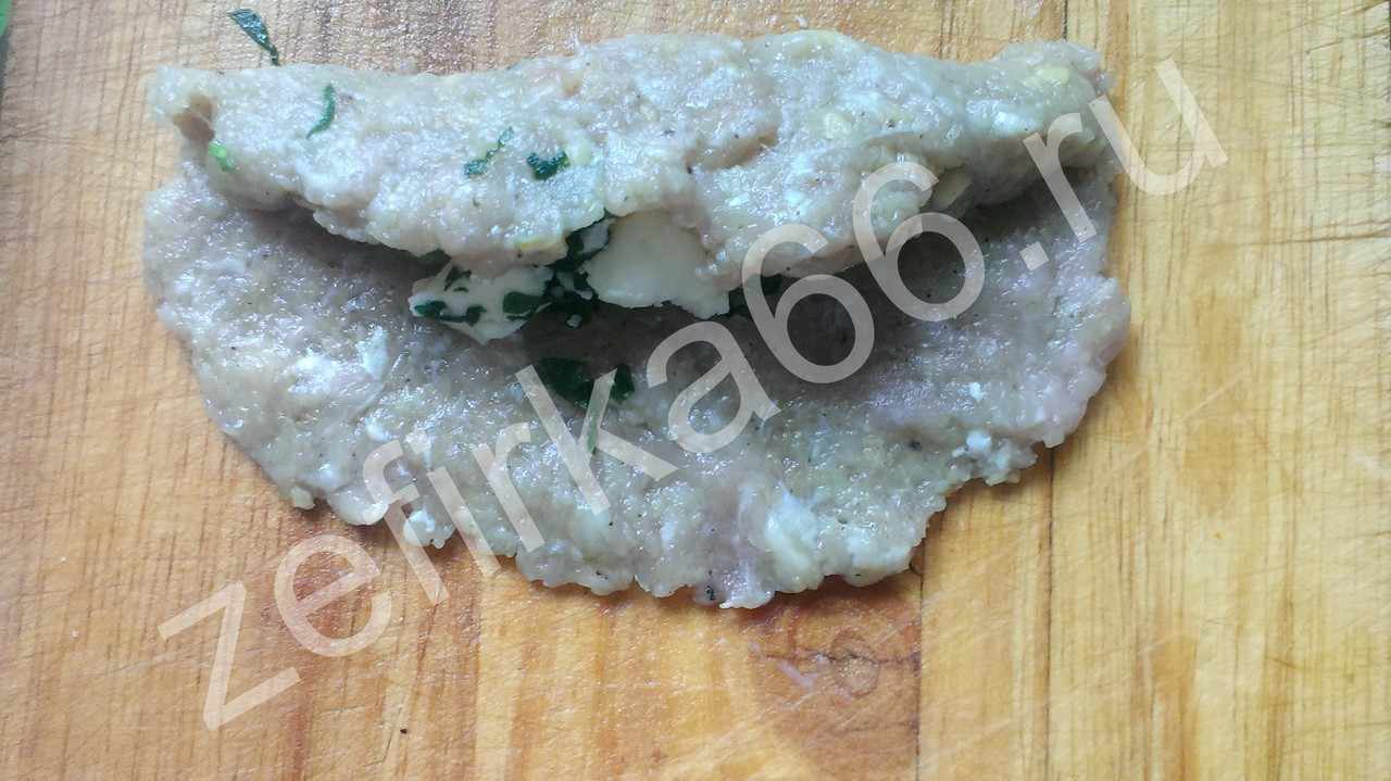 - Разделить на 7 частей. Из каждой сделать лепешку, на середину выкладывать кусочек сливочного масла, обваленного в муке, и формировать котлету.