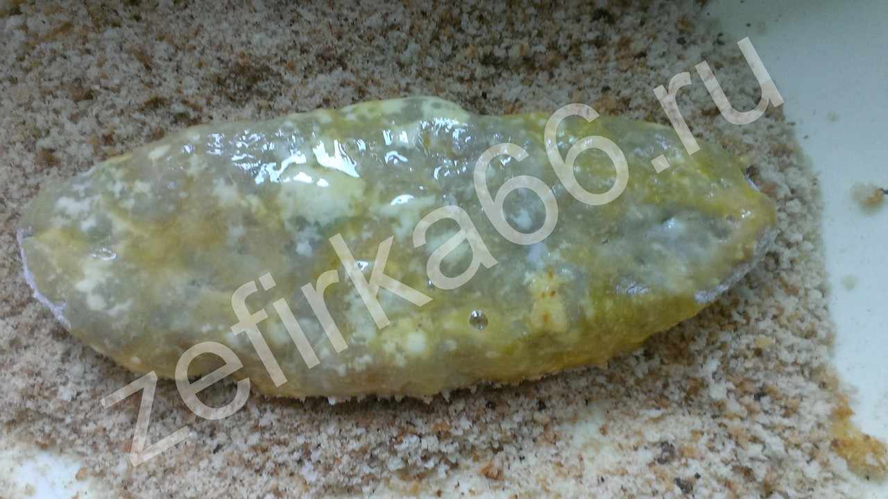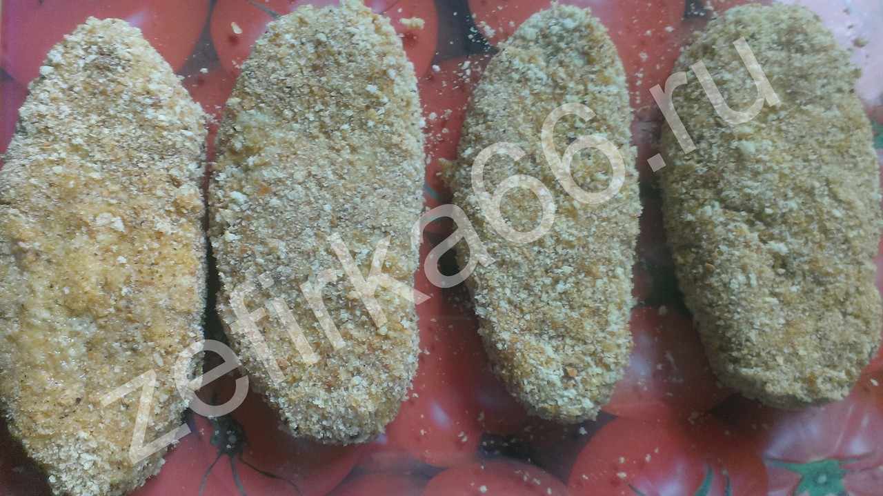 - Хорошенько обваливаем их в сухарях, затем замачиваем в яичной смеси и снова присыпаем панировкой.