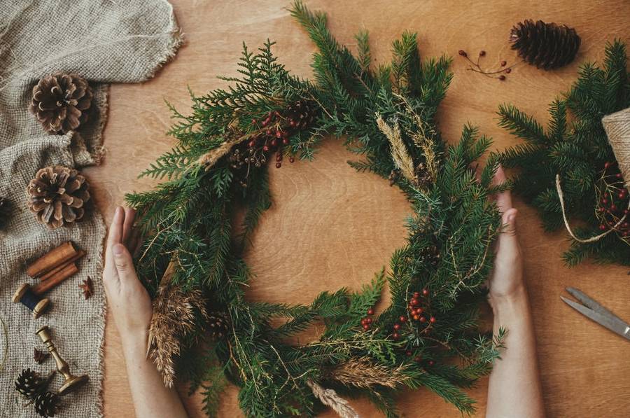 Если хотите аромат хвои, купите (или найдите) парочку веточек. Создайте новогоднюю композицию или венок. Таким образом, и елочки целы будут, и будет аромат.