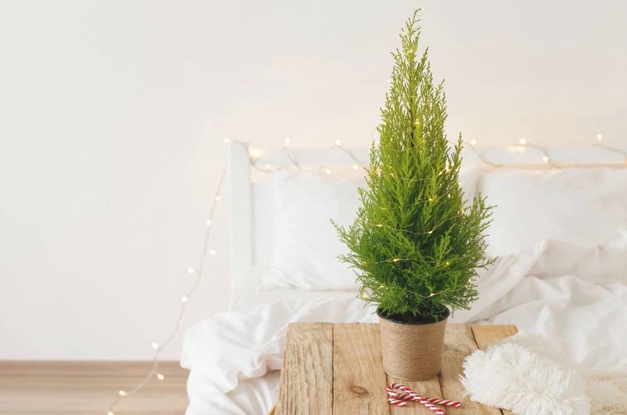 Возможен вариант покупки хвойных комнатных растений (таких как аракурия, кипарис). Конечно, размером они будут маленькие, но зато живые.