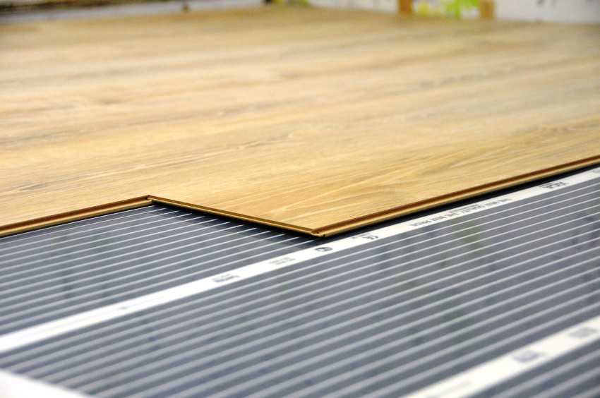 После завершения всех работ следует выполнить пробный запуск теплого пола. Если никаких нареканий и изъянов не обнаружено, на пленку укладывают защитный слой (как правило, это подложка для ламината или других напольных покрытий) и приступают к монтажу напольного покрытия. Его выполняют обычным способом, но с учетом специфики работы теплого пола. Используют специальные виды покрытий (на обратной стороне должен быть значок — змейка со стрелочками, обозначение готовности к работе с теплыми полами).