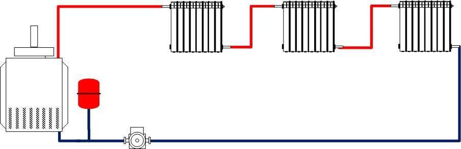 Отличительной чертой системы данного типа является обязательное дополнение ее циркуляционным насосом. Именно он способствует перемещению теплоносителя по трубам. Выглядит схема системы так: