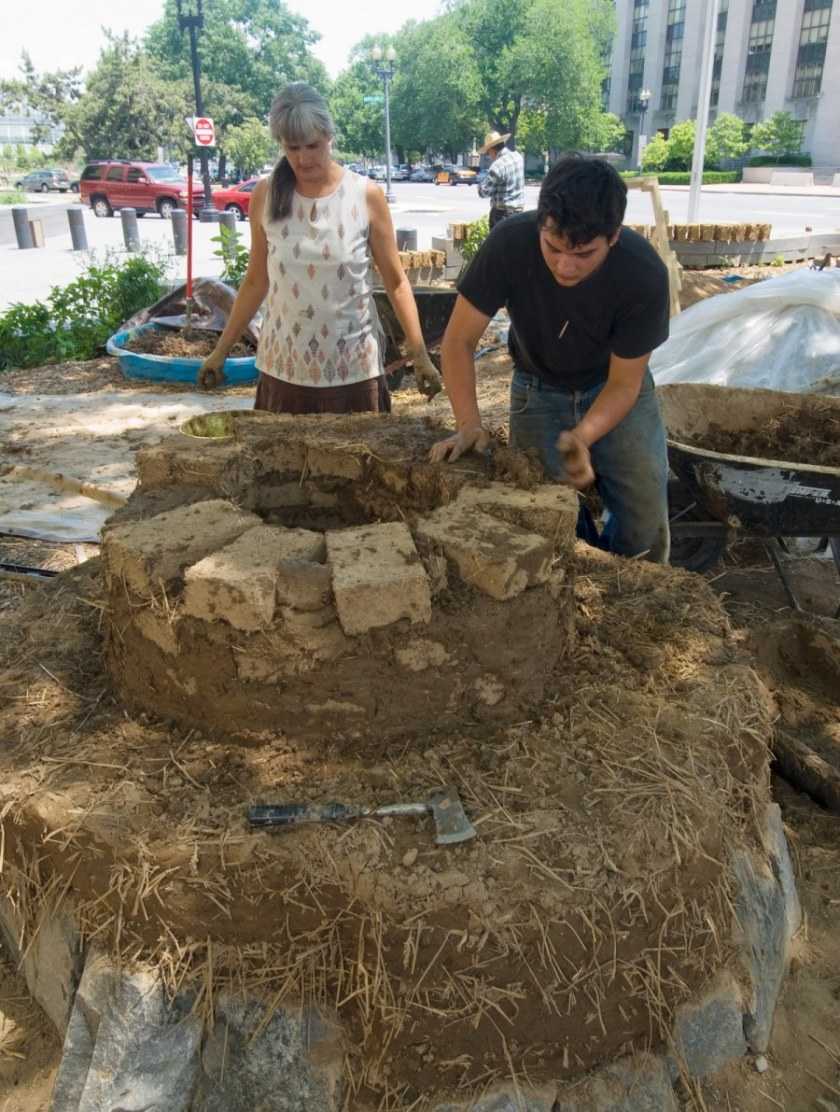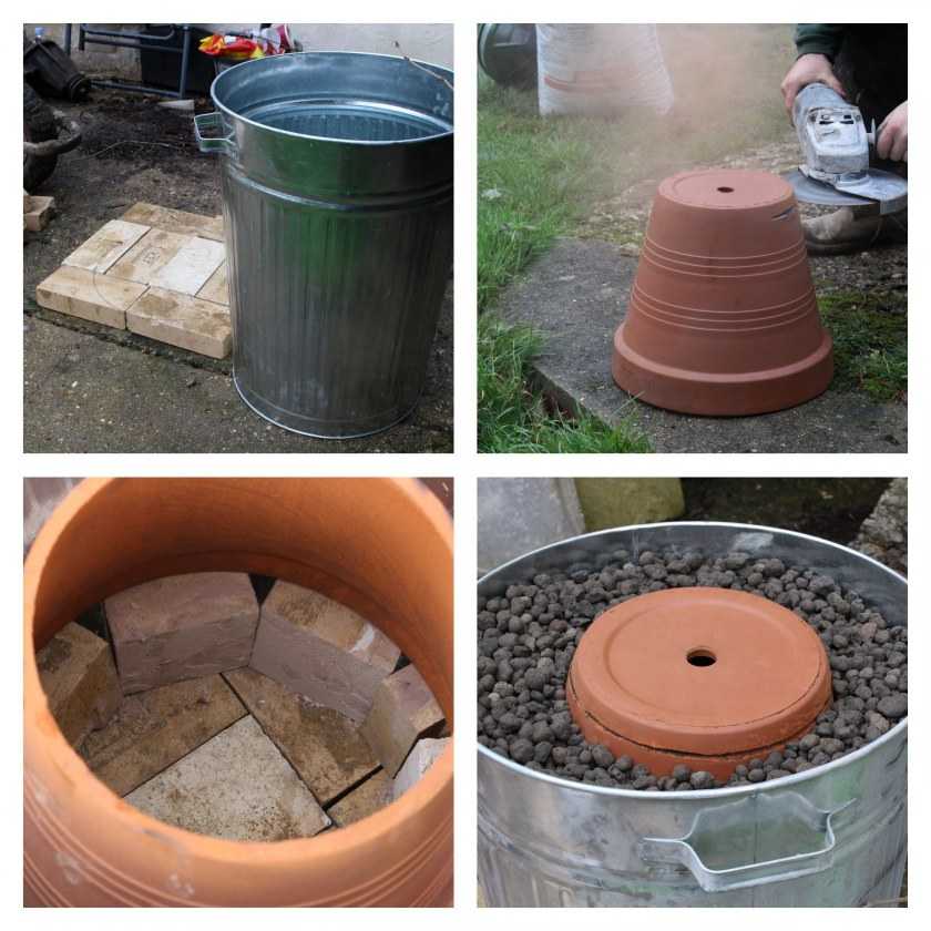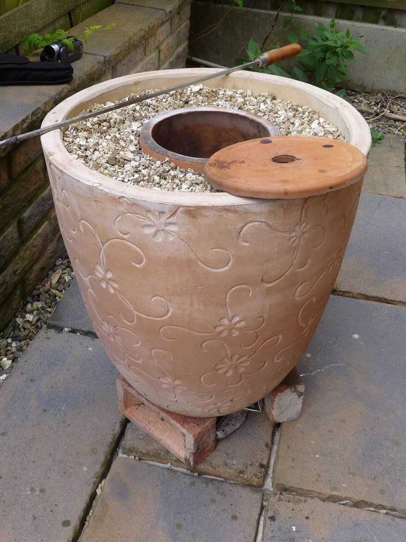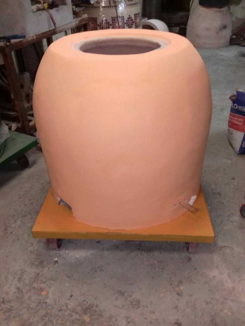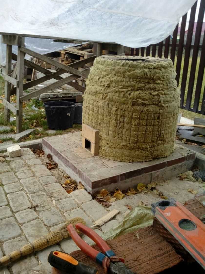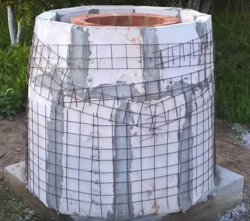 Далее внешние стенки дважды промазывают глиной слоем в 2 см, оборачивают армирующей решёткой, покрывают цементным раствором (смесь 3 частей песка и 1 части цемента).